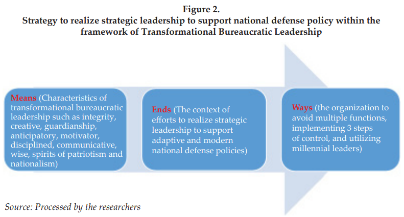 Based on the previously elaborated explanation, it can be understood that the transformational bureaucratic leadership style in the context of national defense policy provides a good framework for the realization of strategic leadership. A strong national defense must be supported by a strategy that can lead to the country’s purpose, which is maintaining the sovereignty of the nation, the existence of the state, and its national interests. The breakthrough offered in this form of leadership is the division of work in organizations that are not burdened with multiple jobs with a form of strict control over the proposed organizational breakdown. This means that the elements of policy makers and determinants must be properly adjusted as a form of organizational revitalization. The level of dealing center management plays an important role in carrying out functions in the organization so that there is solidity and synergy between existing functions.